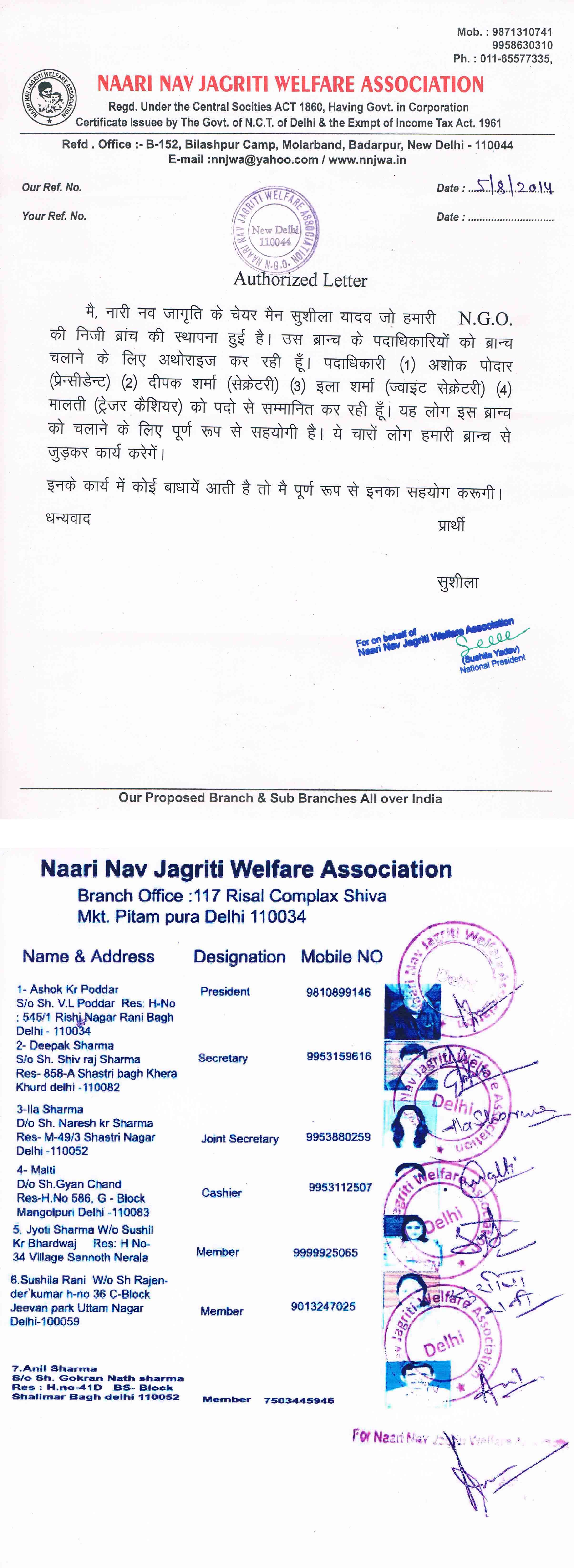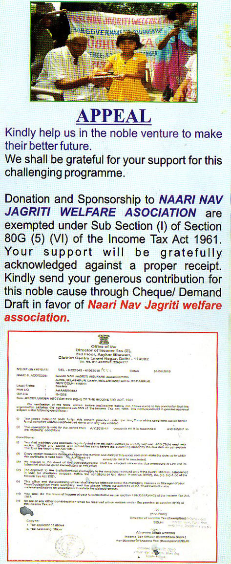 Donation and Sponsorship to Naari Nav Jagriti Welfare Association are exempted under Sub Secti o n (I) of Section 80G (5) (VI) of the Income Tax Act 1961. Your support will be gratefully acknowledged again s t a proper receipt. Kindly send your generous contribution for this noble cause through Cheque/ Demand Draft in favour of Naari Nav Jagriti welfare association